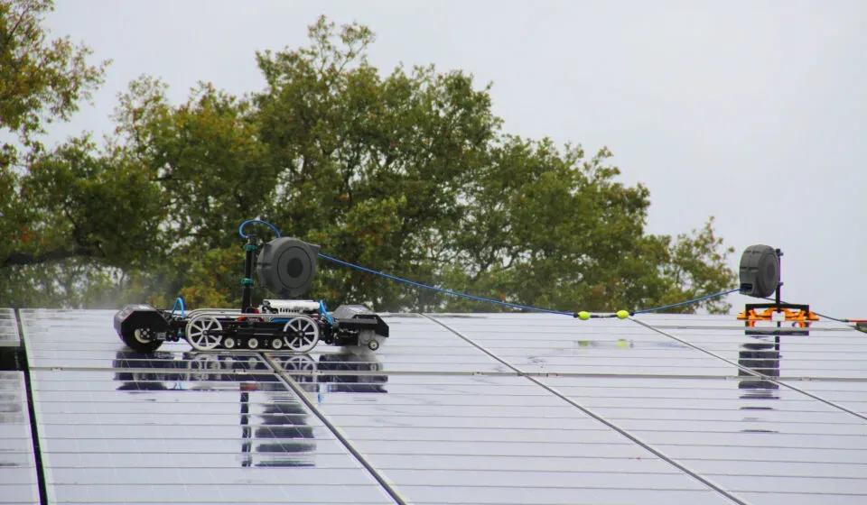 Voor het reinigen van de zonnepanelen gebruiken wij een van onze reinigingsrobots. Met een hoogwerker wordt de robot op de installatie gebracht. De robot wordt door een van onze medewerkers op afstand aangestuurd.
